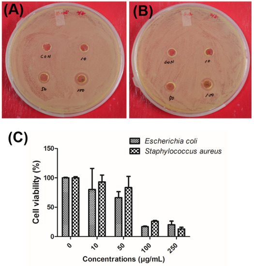 Antimicrobial activity of chitosan–fucoidan complex-coated AgNPs at different concentrations (10 µg, 50 µg, and 100 µg). (A) E. coli colonies. (B) S. aureus colonies. (C) Viability of E. coli and S. aureus after treated with chitosan–fucoidan complex-coated AgNPs.