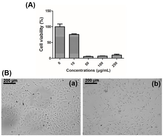 The cytotoxicity of chitosan–fucoidan complex-coated AgNPs was assessed against human cervical cancer cells (HeLa). The cells were treated with different concentrations of AgNPs (10, 50, 100, and 250 µg/mL) for 24 h. Significant cytotoxicity was observed at the 50 µg/mL of concentration, and the IC50 value was found to be around 35 µg/mL (Figure 7A). Jang et al. reported that biosynthesized AgNPs have efficient anticancer activity by upregulation of p53 gene expression [50]. The cytotoxicity in cancer cells is associated with changes in morphology and loss of adherence and rounding, which was clearly shown in Figure 7B [49].