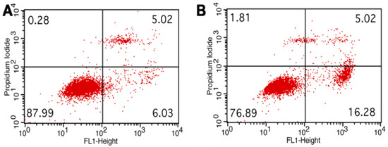 Flow cytometry analysis of (A) untreated HeLa cells and (B) HeLa cells treated with chitosan–fucoidan complex-coated AgNPs at 250 µg/mL.