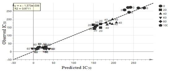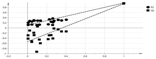 The goodness of fit and the predictability of the OPLS model result can be validated by checking R2 [33]. The goodness of plot predicted values is R2 > 0.9 [34], and this model showed R2 = 0.9711. Therefore, the model is considerably good as shown in Figure 4. The extrapolated Y value of the R2 and Q2 line was 0.109, −0.533 as shown in Figure 5. Generally, an intercept Y value were below 0.3, and −0.05 for R2 and Q2 respectively [30]. Therefore, this analysis showed that this model is valid. The external validation to validify the model was carried out using external salak fruit. A total of eight salak fruits were extracted using 60% concentration ethanol. Original and predicated values of α-glucosidase inhibitory activity of 60% ethanol extracts of the salak fruit were illustrated in Table 2. Hence, the model was also valid using external samples, therefore, this model can be used for rapid validation.
