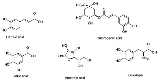 The line loading plot from multivariate data analysis of different extracts of the salak fruit are shown in Figure 3. The plot provides information on the possible biological activities of the absorption peaks obtained from the FT-IR spectrum. It also assesses the characteristics of each spectrum that may promote or reduce α-glucosidase inhibition. Khatib et al. in 2017 adopted the use of this FT-IR fingerprinting as a means of correlating the functional groups with the antioxidant activity. It was concluded that functional groups such as C–N, C = O, C–O, C–H, and OH present in the extract influence the antioxidant activity. The uppermost loading plot represents the inhibitory activity, with a positive wave number at the uppermost loading plot representing inhibitory activity with a positive increase in enzyme inhibition. The peaks at 2969, 1737, 1500, 1365, 1229, 1103, and 871 cm−1 were observed to have positive values. These peaks represent the functional groups present in the constituents that are responsible for α-glucosidase inhibition. These are C–H, C=O, C–N, N–H, and C–O that are found in ester, amines, and aldehydes. The peaks at 2973 and 2719 cm−1 can be attributed to C–H stretching vibration of methylene and methyl groups. The peak at 1695 cm−1 depicts vibration of the ketonic group (C=O) present in aldehydes, esters, and fatty acids. The peak at 1439 is due to CH2 bonding vibration in esters and ethers, while that of 1311 cm−1 could be as a result of asymmetric stretching vibration in amines. The peak at 1100 may be due to C–O stretching of fatty acids and esters, S=O (SO2), and C–N (amines) ethers, and anhydride peaks at 850 and 543 cm−1 were a result of C–O stretching and deformation vibration in amines. Various phytochemical constituents were previously reported as an α-glucosidase inhibitor. Chlorogenic acid, caffeic acid, levodopa, and gallic acid were purified from salak fruit using temperature induced phase partitioning technique, while the ascorbic acid content determined through titration method. The outcome of this study shows compounds containing functional groups (C–H, C=C, C=O, and C–O) such as chlorogenic acid, caffeic acid, levodopa, and ascorbic acid which has been reported by previous researchers to be present in salak fruit [30,31] are responsible for α-glucosidase inhibition activity (Figure 6). Additionally, this result also shows that CHO, COOR, SO2, C–N, and N–H contain compounds that contribute significantly to α-glucosidase inhibition activity of salak fruit extracts. This outcome is being reported, for the first time, from this plant. We can, therefore, conclude that the presence of amines, fatty acids, esters, and sulfur-containing compounds may have a positive impact on α-glucosidase inhibition of salak fruit extracts. On the other hand, other peaks at the downmost post of the loading plot do not have a significant contribution to the inhibitory activity.