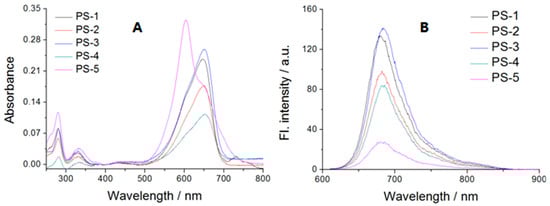 Absorption (A) and fluorescence ((B), excitation at λ 600 nm) spectra of PS1–PS5 at 5 µM in water.