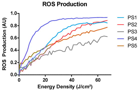 The reactive oxygen species (ROS) generated in photoreactions are the key factor for PDT as they can induce cytotoxicity via damage to different biomolecules, including proteins, nucleic acids and lipids [31,32]. Therefore, compounds PS1 to PS5 were evaluated for their effects on the production of ROS by DPBF method [7]. Figure 3 shows the results of ROS production when the compounds were irradiated with different energy densities. All these molecules produced ROS in an energy-dependent fashion, indicating that they are potential candidates for anticancer PDT. Remarkably, the photoactivated production of ROS was most intense with PS4, suggesting that this compound has the highest quantum yield for ROS generation. PS3, on the contrary, showed the lowest production of ROS compared with others.