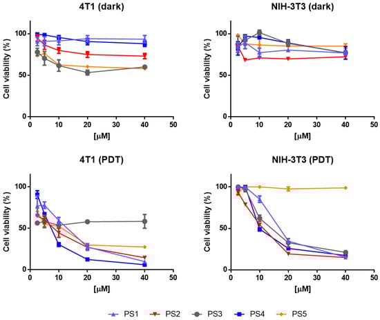 Toxicity of the compounds PS1 to PS5 at different concentrations against 4T1 and NIH-3T3 cells treated in the dark or irradiated with red light (λ 660 nm, 25.8 J/cm2).