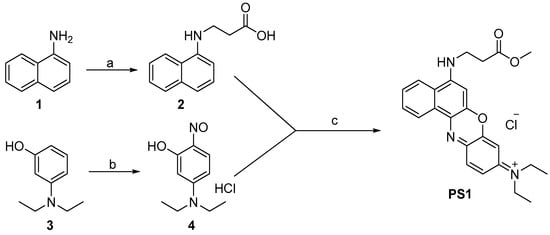 3.2.3. Synthesis of N-Ethyl-N-(5-(3-methoxy-3-oxopropylamino)-9H-benzo[a]phenoxazin-9-ylidene)ethanaminium Chloride (PS1, C24H26ClN3O3)