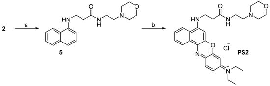 3.2.5. Synthesis of N-Ethyl-N-(5-(3-(2-morpholinoethylamino)-3-oxopropylamino)-9H-benzo[a]phenoxazin-9-ylidene)ethanaminium Chloride (PS2, C29H36ClN5O3)