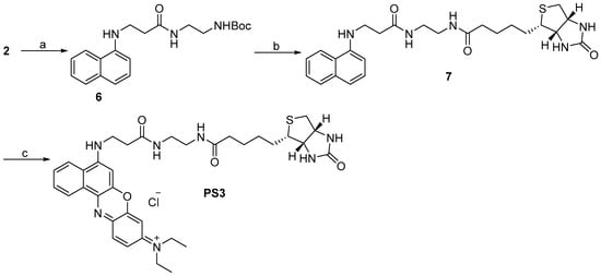 The synthesis of PS3. Reagents and conditions: (a) tert-butyl (2-aminoethyl)carbamate, HATU, iPrNEt2, CH2Cl2; (b) i. trifluoroacetic acid, CH2Cl2, 0 °C, overnight; ii. Biotin-NHS, Et3N, CH3CN, r.t., overnight; (c) 4, EtOH, 5 drops of cocn. HCl, reflux, 4 h.