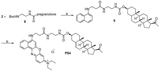3.2.10. Synthesis of N-(5-(3-(2-(((3S,10R,13S,17S)-17-Acetyl-10,13-dimethyl-2,3,4,7,8,9,10,11,12,13,14,15,16,17-tetradecahydro-1H-cyclopenta[a]phenanthren-3-yloxy)carbonylamino)ethylamino)-3-oxopropylamino)-9H-benzo[a]phenoxazin-9-ylidene)-N-ethylethanaminium Chloride (PS4, C47H60ClN5O5)
