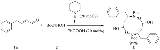 Tandem aza-Michael/hemiacetal reaction between (E)-4-phenyl)but-2-enal 1a and N-Boc-protected hydroxylamine (2) catalyzed by piperidine (I) and benzoic acid to give 3,8-dibenzyl-5,10-dihydroxy-1,6,2,7-dioxadiazecane-2,7-dicarboxylate (3).