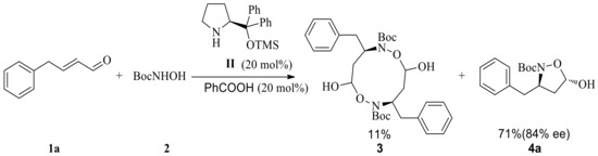 Tandem aza-Michael/hemiacetal reaction between (E)-4-phenyl)but-2-enal 1a and N-Boc-protected hydroxylamine (2) catalyzed by catalyst II and benzoic acid to give 3,8-dibenzyl-5,10-dihydroxy-1,6,2,7-dioxadiazecane-2,7-dicarboxylate (3) and (3R,5S)-tert-butyl 3-benzyl-5-hydroxyisoxazolidine-2-carboxylate (4a).