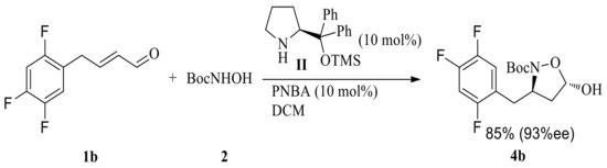 (E)-4-(2,4,5-Trifluorophenyl)but-2-enal 1b was obtained via either the cross-metathesis reaction between 1-allyl-2,4,5-trifluorobenzene and crotonaldehyde or the coupling reaction between 1-bromo-2,4,5-trifluorobenzene and (E)-4-bromo-1,1-dimethoxybut-2-ene [21]. Tandem aza-Michael/hemiacetal reaction between (E)-4-(2,4,5-trifluorophenyl)but-2-enal 1b and N-Boc-hydroxylamine catalyzed by 10 mol % (S)-diphenylprolinol-TMS II and 10 mol % p-nitrobenzoic acid gave (3R,5S)-N-Boc-5-hydroxy-3-(2,4,5-trifluorobenzyl)isoxazolidine 4b in 85% yield and 93% ee (Scheme 3). Decreasing the reaction temperature to −20 °C improved the enantioselectivty. The ee was up to 96% with an extended reaction time (15 h), and yield was up to 85%.