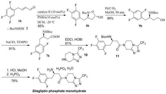 (R)-N-Boc-β-(2,4,5-trifluorobenzyl)-β-amino acid 7b was synthesized starting from (E)-4-(2,4,5-trifluorophenyl)but-2-enal in 76% total yield in a three-step procedure (Scheme 6). (R)-tert-butyl 4-oxo-4-(3-(trifluoromethyl)-5,6-dihydro-[1,2,4]triazolo[4,3-a]pyrazin-7(8H)-yl)-1-(2,4,5-tri-fluorophenyl) butan-2-ylcarbamate 11 was obtained in 91% yield via the coupling reaction between triazole (10) and (R)-N-Boc-β-(2,4,5-trifluorobenzyl)-β-amino acid 7b, using HOBt-EDCI as the coupling agent. Finally, >99.9% ee of sitagliptin phosphate monohydrate was provided in 78% yield following the known literature procedure (as shown in Scheme 6) [6].