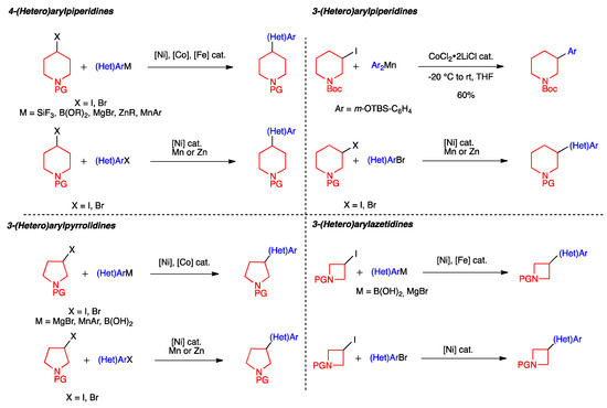 Despite the variety of reactions existing for the arylation of saturated N-heterocycles from halogeno precursors, a unified method allowing the arylation of 4- and 3-halopiperidines, 3-halo-pyrrolidines and 3-haloazetidines was still needed. During the course of our studies toward the development of sustainable methods to access biologically relevant scaffolds, cobalt-catalyzed arylation of saturated halogeno N-heterocycles was investigated [51,52,53]. Herein, we report an overview of our work concerning the arylation of 4-iodopiperidines and 3-iodopiperidines, -pyrrolidines and -azetidines. The reactions are efficient, versatile, chemoselective and involve a non-expensive catalytic system (Scheme 2) [54,55].
