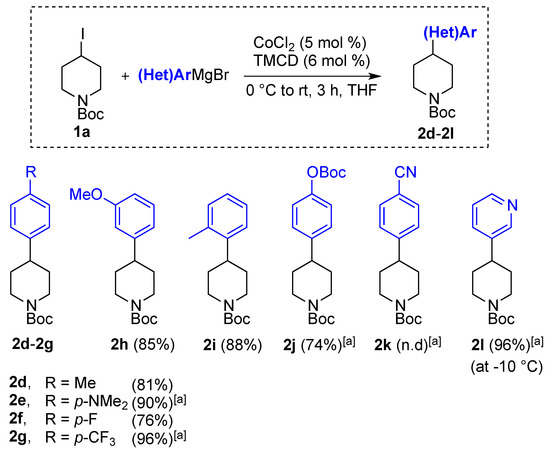 A range of aryl magnesium bromides was used in the cross-coupling with N-Boc 4-iodo- piperidine 1a. The electronic properties of the substituents present on the phenyl ring had little influence on the reaction as both electron-donating (p-Me, p-NMe2) and electron-withdrawing (m-OMe, p-F, p-CF3) groups were well tolerated. In some cases, the Grignard reagent was prepared as an LiCl complex according to a method reported by Knochel et al. using a catalytic amount of DIBAL-H and a stoichiometric amount of LiCl [56]. These Grignard reagents exhibited similar reactivity to the classical ones under the coupling conditions. The coupling was not sensitive to steric hindrance and o-tolylmagnesium bromide reacted smoothly with iodopiperidine 1a to deliver 2i in a good 88% yield. The formation of the 4-arylpiperidine 2j possessing a carbonate substituent on the phenyl ring highlighted the chemoselectivity of the cross-coupling. However, in the presence of a cyano group, the reaction turned sluggish leading to a poor conversion of 1a (1a/2k = 70:30) that did not allow the isolation of the corresponding 4-arylpiperidine 2k. A poisoning of the catalyst by coordination of the nitrile group could account for this limitation. Pleasingly, 3-pyridylmagnesium bromide was efficiently coupled to iodopiperidine 1a, a decrease in temperature being the key to achieve a high yield in 2l (96%). Despite its Lewis basicity, the nitrogen atom present on the pyridine moiety does not seem to interfere with the cobalt catalyst (Scheme 3).