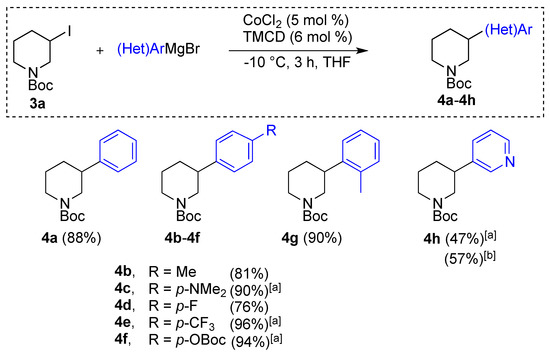Scope of the cross-coupling involving N-Boc-3-iodopiperidine 3a and various aryl Grignard reagents. [a] Grignard reagents prepared as ArMgBr.LiCl were used [56]. [b] Using 50 mol % of TMCD.