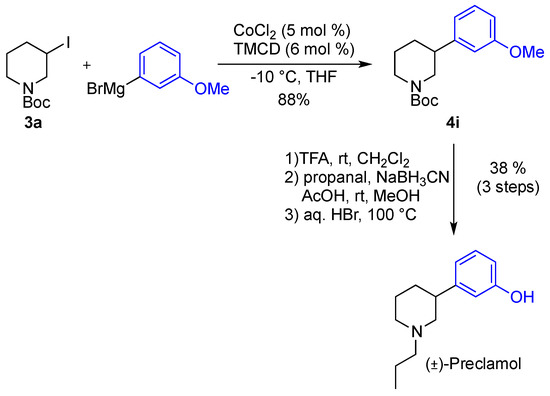 The cross-coupling was then used at the key step in a concise synthesis of the antipsychotic (±)-preclamol [57,58,59]. Treatment of the N-Boc 3-iodopiperidine 3a with m-methoxyphenylmagnesium bromide in the presence of the CoCl2/TMCD catalytic system afforded the 3-arylated piperidine 4i (88%). After the amine deprotection and reductive amination, the N-propylpiperidine was obtained. Finally, the cleavage of the methoxyether under acidic conditions (HBr) delivered (±)-preclamol (33% overall yield over four steps) (Scheme 5).