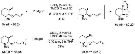 In the literature, the formation of radical species during cobalt-catalyzed cross-coupling has been observed on several occasions [60,61,62,63]. To determine if radical intermediates were present during the arylation of 3-iodopiperidines under our optimized conditions, two radical clocks were synthesized. When the disubstituted 3-iodopiperidine 5a possessing an O-allyl group at C2 was treated with phenylmagnesium bromide in the presence of CoCl2 and TMCD, the bicyclic compound 6a was formed exclusively (81%, dr = 80:20) (Scheme 6). This product results from a 5-exo-trig cyclization prior to the cross-coupling. On the contrary, iodopiperidine 5b, possessing an additional carbon atom on the C2 pendant chain, was transformed in the 3-phenylpiperidine 6b resulting from a direct cross-coupling at C3 (Scheme 6). These results could suggest that transient radical intermediates were formed during the coupling. The evolution of these species (cyclization then cross-coupling versus direct cross-coupling) would depend on the kinetic of the cyclization, the 5-exo-trig cyclization being approximately 1000 times faster than the 6-exo-trig cyclization.