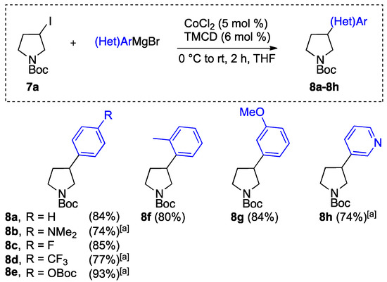 The cross-coupling was then successfully extended to the arylation of 3-iodopyrrolidines. A library of 3-arylpyrrolidines was prepared using a similar catalytic system to the one used for the arylation of iodopiperidines [CoCl2 (5 mol %), TMCD (6 mol %)]. Whatever the nature of the aryl Grignard reagent, the 3-arylpyrrolidines were obtained with good to excellent yield (74%–93%) (Scheme 7) [56].