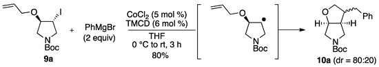 When iodopyrrolidine 9a bearing an O-allyl chain at C4 was involved in the cross-coupling, the bicyclic compound 10a was obtained as the sole product with a good yield of 80% (dr = 80:20) (Scheme 8). The existence of this 5-exo-trig cyclization prior to the cross-coupling supports the hypothesis of radical intermediate formation during the reaction.