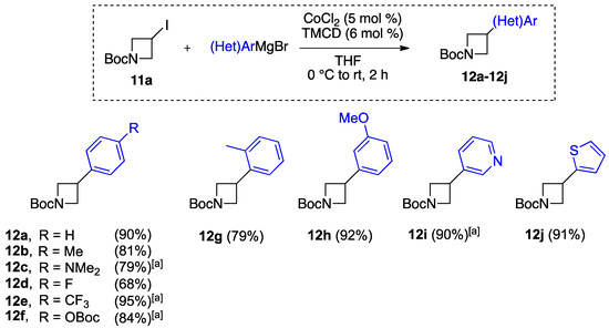 Pleasingly, the same catalytic system proved also efficient for the arylation of N-Boc 3-iodoazetidine 11a. A broad range of aryl groups were efficiently introduced at the C3 position of the azetidine. Interestingly, heteroaryl Grignard reagents incorporating either a pyridine or a thiophene moiety were well tolerated, leading to the corresponding azetidines 12i and 12j with excellent yields of ca. 90% (Scheme 9) [56].