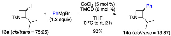 The reactivity of 2,3-disubstituted azetidines was then investigated and a mixture of cis- and trans-iodoazetidines 13a (cis-13a/trans-13a = 75:25) was treated with phenylmagnesium bromide in the presence of CoCl2 and TMCD. The desired arylated product was isolated in 93% yield as a mixture of diastereomers, the trans diastereomer being the major product (cis-14a/trans-14a = 13:87) (Scheme 10). The inversion of the cis/trans ratio could be due to the formation of a radical intermediate at the C3 position that allowed a diastereoconvergent coupling to occur. However, an epimerization of the organocobalt species resulting from the oxidative addition step could not be excluded.