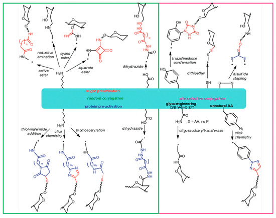 Carbohydrates can be linked to proteins applying a variety of approaches (Figure 1). Amino acid residues that are most suitable for chemical linkage to sugars are those who are exposed onto the protein surface and whose side chains have reactive functional groups, such as primary amino groups of lysines and carboxylic groups of glutamic or aspartic acid residues. Carboxyl groups of proteins can be conjugated to amino or hydrazido derivatives of sugars by a carbodiimide mediated condensation. Lysine amino groups can be coupled to sugars by reaction with their derivatives containing active groups such as succinimido esters or cyano-esters, squarate, or by direct reductive amination [7,66].