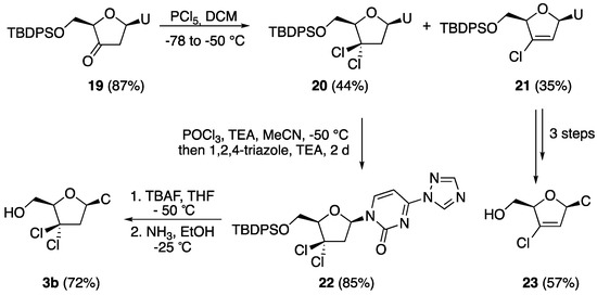 In a similar fashion, 3′-keto-2′-deoxyribonucleoside derivative 19 bearing uracil as nucleobase was synthetized in two steps from 2′-deoxyuridine (see Materials and Methods). After the chlorination step, a 1.2:1 mixture of di- (20) and monochlorinated (21) derivatives was formed, which were isolated by subsequent chromatrographic purification and additionally submitted to pyrimidine base interconversion under standard conditions (Scheme 3). However, when the transformation into of the corresponding triazolyl intermediates (for example compound 22) was conducted at room temperature, only poor product yields were observed due to the formation of side products originating from the nucleobase elimination. Pleasingly, it was found that by premixing 20 (and analogously 21) with POCl3 in dry acetonitrile at low temperature (−50 °C) prior to the slow addition of triethylamine, followed by an acetonitrile solution containing 1,2,4-triazole and triethylamine, no degradation was observed. After desilylation and substitution at the 4-position, gem-dichloro compound 3b was obtained in good yield (72%) over two steps, while compound 23 was also synthesized in 3 steps from 21 with an overall yield of 54%.