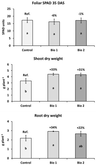 Under controlled conditions (pots in a greenhouse), both biostimulants did not affect the SPAD (Soil Plant Analysis Development) index, as representative of the leaf chlorophyll content, at the 4–5 leaf stage, while enhanced plant growth. Bio1 significantly increased both shoot (+33%) and root (+34%) biomass (p ≤ 0.05) as compared to controls, and Bio2 significantly improved shoot weight (+31%) (Figure 1).