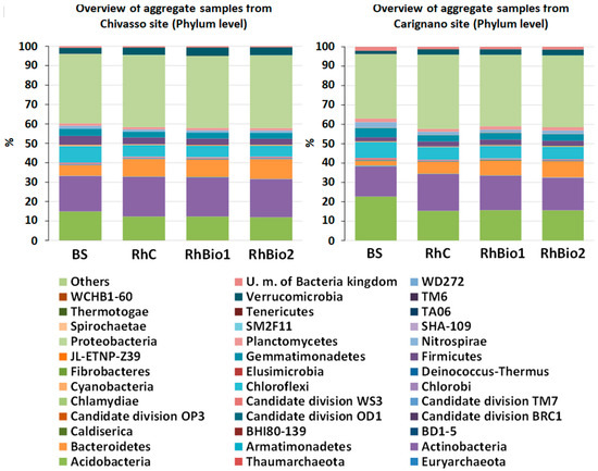 A total of 2,066,787 raw 16S rDNA reads were obtained from 32 soil analyses (four biological replicates, each of BS, RhC, RhBio1, and RhBio2 from the Chivasso and Carignano fields). After filtering and removing the chimaeras, a total of 1,539,514 sequences were retained with mean numbers of total sequences per sample (average read of four replicates) ranging from 47,593 to 60,212 (Table S1).