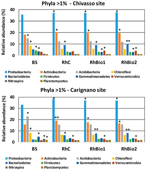 The percentage of phyla present at >1% in all the soil samples from the two sites, Chivasso and Carignano, based on 16S rDNA reads. BS = bulk soil; RhC = rhizosphere of control plants; RhBio1 = rhizosphere of plants from seeds coated with Bio1; RhBio2 = rhizosphere of plants from seeds coated with Bio2. Data from each soil type are derived from four biological replicates (each consisting of the rhizosphere of six plants). Significantly different values among treatments within same site are indicated with asterisks, (* p ≤ 0.05; ** p ≤ 0.01).