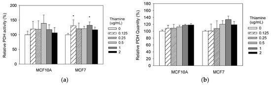 Thiamine increases cellular pyruvate dehydrogenase (PDH) activities in breast cancer cells. Cells were treated with range of doses of thiamine for 24 h, and PDH activity (a) and quantity (b) were then measured using the PDH combo microplate assay kit (Abcam, Inc., Cambridge, MA, USA). Results are expressed as mean ± SE (* significant difference relative to control (0 μg/mL Thiamine supplementation), white bar).