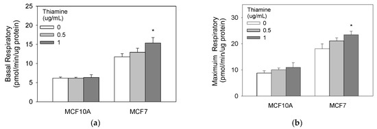 We next investigated the metabolic changes induced by thiamine in both breast cancer and non-tumorigenic cells using Seahorse XFe96 oxygen consumption analyzer. These mitochondrial stress tests indicate that 1 μg/mL of thiamine supplementation over 24 h significantly increased basal, maximum, and ATP production oxygen consumption rate for the MCF7 but not in non-tumorigenic MCF10A cells (Figure 3).