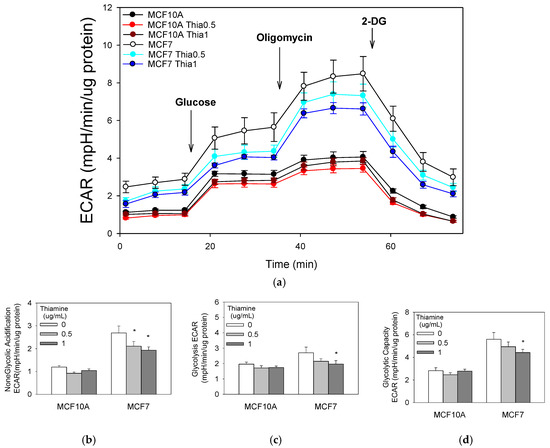 We also investigated the extracellular acidification rate (ECAR) coupled to glycolysis. Both cell types were starved of glucose for two hours; then, the change in medium acidification was measured after administration of a bolus of glucose. Breast cancer MCF7 cells ECAR after 2 h of glucose starvation were approximately twofold greater than the non-tumorigenic MCF10A cells. Immediately following the addition of glucose, glycolytic ECAR was measured. Extracellular acidification in MCF7 cells occurred at a significantly greater rate compared with non-tumorigenic MCF10A cells (Figure 4). Cellular glycolytic capacity was determined by adding oligomycin, an inhibitor of ATP synthase, to the cell cultures. After this treatment, cells reduced their mitochondrial respiration and maximized their glycolic ATP production. Glycolytic capacity and reserve glycolytic capacity significantly increased in MCF7 cell cultures compared with MCF10A cells, further suggesting that breast cancer cells modify themselves to satisfy ATP energetic demands by acquiring a glycolytic phenotype. The addition of 2-deoxyglucose (2-DG), an inhibitor of the first step of glycolysis, confirmed that the ECAR measured was a result of glycolytic metabolism. Following 2-DG treatment, ECAR was restored to non-glycolytic levels in both cell lines. More importantly, 0.5 μg/mL and 1 μg/mL of thiamine treatment for 24 h significantly decreased the non-glycolytic acidification in breast MCF7 cancer cells, but not in non-tumorigenic cells (Figure 4).