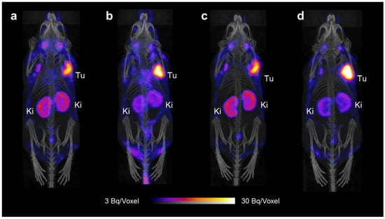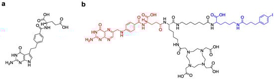 We were the first to demonstrate the fact that the antifolate pemetrexed (PMX, AlimtaTM, Figure 1a [11]) increases the tumor-to-background ratio of accumulated radioactivity when injected one hour prior to the radiofolate [12]. This concept was further investigated in different preclinical settings with a variety of radioligands including [111In]DTPA-folate and [99mTc]EC20 that had previously been tested in patients [13,14,15,16]. The “antifolate effect” was reproducible in different animal models including xenograft and syngeneic tumor mouse models [13,14,15]. Hence, it could be shown repeatedly by our group and others that this concept improved the tissue distribution of any radiofolate by reducing retention in the kidneys [17]. We were also able to demonstrate, that the combination of PMX and [177Lu]folate can enhance the therapeutic outcome and, in addition, reduce undesired side effects of radiofolates [18]. These findings were based on the radiosensitizing potential of PMX [19,20,21], and the reduction of accumulated activity in the kidneys [12]. Even though this approach revealed to be highly promising, the tumor-to-kidney ratio of accumulated activity was still <1 when using the most promising folate radioconjugates (e.g., DOTA-conjugates [22]). This fact presented a hurdle for therapeutic application of radiofolates as the risk of damage to the kidneys would be high.