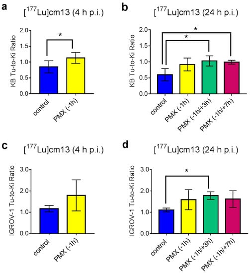 Tumor-to-kidney ratios of mice after injection of [177Lu]folate (5 MBq, 1 nmol). (a) Tumor-to-kidney ratios of KB tumor-bearing mice 4 h after injection of [177Lu]cm13 without pre-injected PMX (blue) or with pre-injected PMX (yellow). (b) Tumor-to-kidney ratios of KB tumor-bearing mice 24 h after injection of [177Lu]cm13 without pre-injection of PMX (blue) or with pre-injection of PMX 1 h before the radiofolate (yellow) or 1 h before and 3 h (green) or 7 h (red) after injection of the radiofolate. (c) Tumor-to-kidney ratios of IGROV-1 tumor-bearing mice 4 h after injection of [177Lu]cm13 without pre-injected PMX (blue) or with pre-injected PMX (yellow). (d) Tumor-to-kidney ratios of IGROV-1 tumor-bearing mice 24 h after injection of [177Lu]cm13 without pre-injection of PMX (blue) or with pre-injection of PMX 1 h before the radiofolate (yellow) or 1 h before and 3 h (green) or 7 h (red) after injection of the radiofolate. Statistically significant values are indicated with asterisks (* p ≤ 0.05).