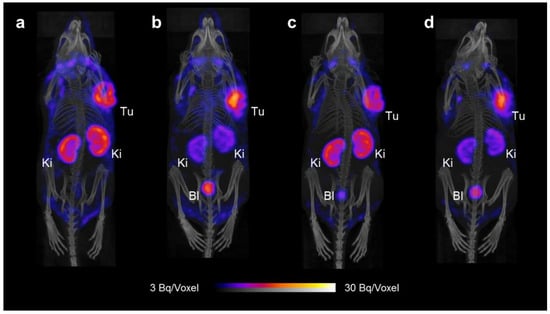 SPECT/CT scans of tumor-bearing mice injected with [177Lu]cm13 (25 MBq; 1 nmol) shown as maximum intensity projections (MIPs). (a) KB tumor-bearing mouse 4 h after injection of [177Lu]cm13. (b) KB tumor-bearing mouse 4 h after injection of [177Lu]cm13 with PMX injected 1 h before the radiofolate. (c) KB tumor-bearing mouse 24 h after injection of [177Lu]cm13. (d) KB tumor-bearing mouse 24 h after injection of [177Lu]cm13 with PMX injected 1 h before and 7 h after the radiofolate. (Tu = KB tumor; Ki = kidney; Bl = urinary bladder).