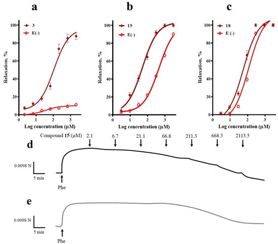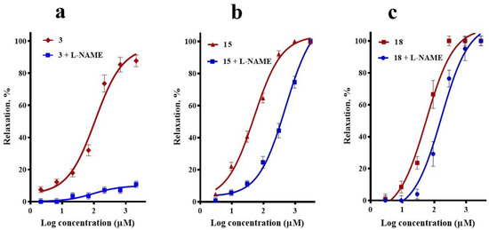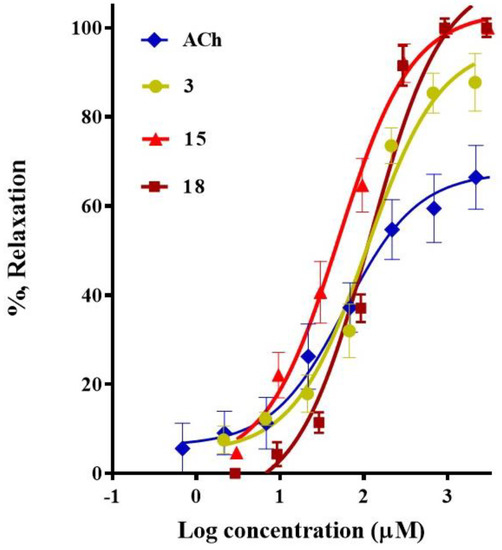 To determine whether the vasorelaxant response of compounds 3, 15, and 18 was dependent on the vascular endothelium, assays on aorta segments without endothelium were performed. In these experiments, the endothelium was removed by flushing the lumen of the aorta with 0.2% desoxycholic acid in saline solution 0.9%, as previously reported [77]. The absence of endothelium was confirmed at the start of the experiments, showing that the addition of 1 μM of ACh did not induce more than 5% relaxation.