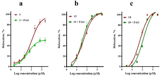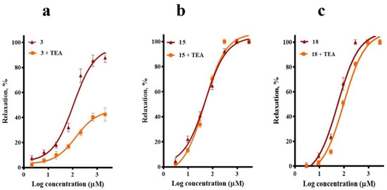 To assess whether activation of the K+ channels was involved in the vasodilation produced by compounds 3, 15, and 18, the effect of pretreatment with the non-selective potassium channel blocker, 1 mM TEA, was evaluated [80,81].
