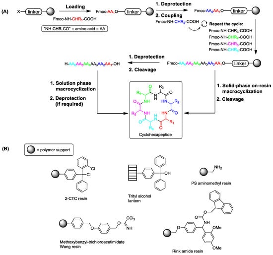 (A). Illustration of solid-phase cyclohexapeptide synthesis. (B). Resins highlighted in this review.