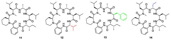 Structures of naturally occurring cyclohexapeptides 11–14.
