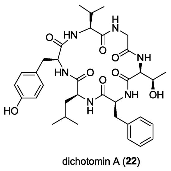 Cyclohexapeptides 15–21 were screened with P. falciparum K1 and infective T. b. brucei assays. Of particular interest was the promising antimalarial activity shown by 17, 20, and 21 against P. falciparum K1, with EC50 (50% of maximal effective concentration) values of 0.19, 0.19, and 0.41 µM, respectively, and no observed cell cytotoxicity against murine macrophages [37]. Also noteworthy was the antitrypanosomal activity of 15 and 19–21 against T. b. brucei, with EC50 values of 1.06, 2.1, 3.0, and 2.8 µM, respectively [37].