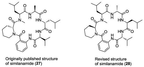 In 2015, Prompanya et al. isolated a cyclohexapeptide from a culture of the marine sponge-associated fungus Aspergillus similanensis KUFA 0013 and named it similanamide (27) (Figure 6) [40]. Masuda et al. undertook the total synthesis of similanamide (27) in 2015 [41] but noticed discrepancies when comparing the 1H and 13C-NMR data of their synthesized similanamide (27) with reported data [40]. The reported data for similanamide (27) did, however, agree favorably with a previously synthesized diastereomer 28 [41]. This led to the structural revision of similanamide (27) to the structurally similar diastereomer 28 in 2015 [41].