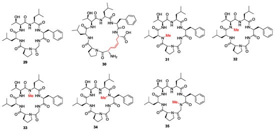 In 2016, Amso et al. reported the synthesis of cyclohexapeptide dianthin G (cyclo-Pro-Leu-Thr-Leu-Phe-Gly, 29) as well as nine of its analogues, including Nα-methylated derivatives (31–35) and conformationally constrained cyclic “dicarba” bridged analogues (e.g., 30) (Figure 7) [42,43]. The in vitro osteoblast proliferation activity of the synthesized compounds was determined. Dianthin G (29) and its Nα-methylated derivatives (31–35) were synthesized by SPPS followed by cleavage and solution-phase head-to-tail macrolactamization.