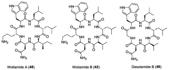 In 2018, our group reported the antitubercular and antibacterial activities of wollamides A (48) and B (42) and desotamide B (49) as well as structural analogues thereof [46]. The optimized synthetic route to access these compounds was described previously [45]. The 27 peptides’ library was screened against a panel of Gram-positive and -negative bacterial pathogens, which discovered that wollamides A (48) and B (42) and the position-II L-Ile analogue 52 exhibited promising antibacterial activity against Mycobacterium tuberculosis, with MIC values of 1.56 µg/mL and favorable selectivity indexes (SIs) of >100 (Figure 10) [46]. The cyclic nature of the wollamide cyclohexapeptides was crucial for their antibacterial activity, as the corresponding linear hexapeptide precursor did not show activity even at the highest concentration tested (200 µg/mL) [46]. The residues at positions II and VI were found to have a major impact on the activity and selectivity, and hence further structure–activity relationship (SAR) studies that focus on optimizing these residues are highly warranted.