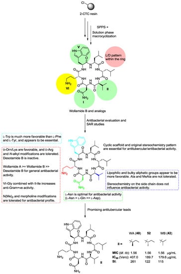 - Asfaw, H.; Laqua, K.; Walkowska, A.M.; Cunningham, F.; Martinez-Martinez, M.S.; Cuevas-Zurita, J.C.; Ballell-Pages, L.; Imming, P. Design, synthesis and structure-activity relationship study of wollamide B; a new potential anti TB agent. PLoS ONE 2017, 12, e0176088. [Google Scholar] [CrossRef] [PubMed]