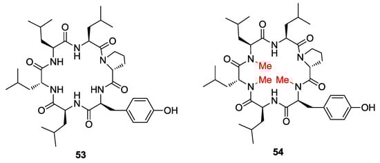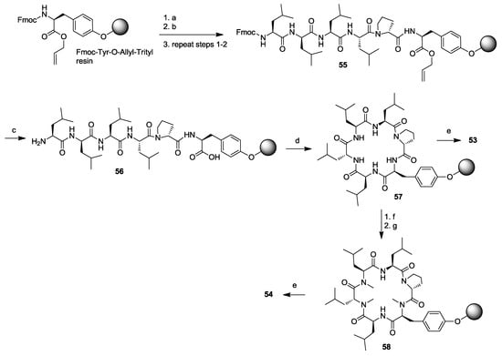 In 2015, Lewis et al. synthesized two cyclic hexapeptides, 53 and 54 (Figure 11), in order to probe their cell permeability and PK properties, including oral bioavailability [23]. They demonstrated that the tri-N-methylated peptide 54 experienced increased cell permeability, higher plasma protein binding, and decreased clearance rates compared to the non-methylated variant 53 [23]. This resulted in a favorable bioavailability of 30% for the tri-N-methylated cyclohexapeptide 54. The cyclic hexapeptides cyclo-Leu-D-Leu–Leu-Leu-D-Pro-Tyr (53) and cyclo-Leu-NMe-D-Leu-NMe-Leu-Leu-D-Pro-NMe-Tyr (54) were synthesized using traditional SPPS starting from a trityl resin preloaded with allyl ester Fmoc-Tyr, which was resin-linked via the Tyr side-chain hydroxyl group (Scheme 10). The resin-linked linear hexapeptide 55 was constructed using a sequence of coupling and deprotection steps. The allyl and N-terminal Fmoc groups were removed using Pd(PPh3)4 and 10% piperidine/THF, respectively, to give 56, which was cyclized on-resin using HATU/HOBt to give the resin-attached cyclohexapeptide 57. Cleavage of 57 from the resin using TFA provided 53. Cyclohexapeptide 54 was synthesized from 57 via the global and selective introduction of N-methyl groups using a LiOtBu base, followed by MeI to provide resin-attached trimethylated derivative 58 (Scheme 10). Cleavage of 58 from the resin afforded 54. An alternative synthesis of 54 was also investigated and involved a stepwise construction of the trimethylated linear hexapeptide using traditional SPPS followed by cleavage and solution-phase macrocyclization. Although two routes for the synthesis of 54 were investigated, the first route involving global N-methylation of the resin-bound cyclohexapeptide 57 followed by cleavage was more efficient and provided crude 54 in higher purity before final purification.