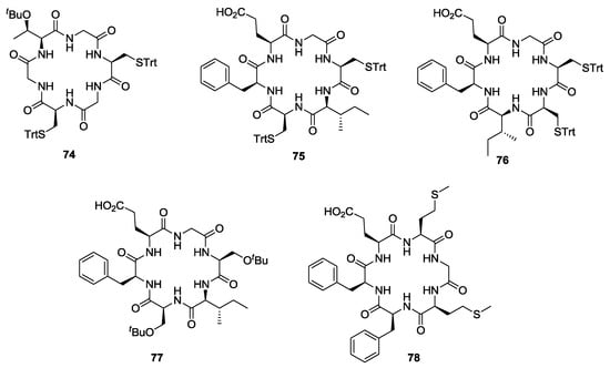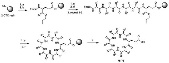 In 2018, Fagundez et al. synthesized cyclohexapeptides via Fmoc/SPPS by using 2-CTC resin followed by macrolactamization either on-resin (75–78) (Figure 13) or in solution phase after cleavage of linear peptide precursors from resin [50]. A general method for the on-resin cyclization of cyclohexapeptides 75–78 is shown in Scheme 14. The synthesis of 74 consists of the peptide sequence being synthesized on the resin in a similar fashion as is discussed above and being cleaved before undergoing macrocyclization in the solution phase. The compounds produced through on-resin cyclization allowed new derivatives to be synthesized as a result of the presence of a free carboxylic acid. Solution-phase cyclization resulted in the ability to produce more diverse cyclic peptides; however, the on-resin route was more convenient, as larger amounts of product with higher yield and acceptable purity could be produced.