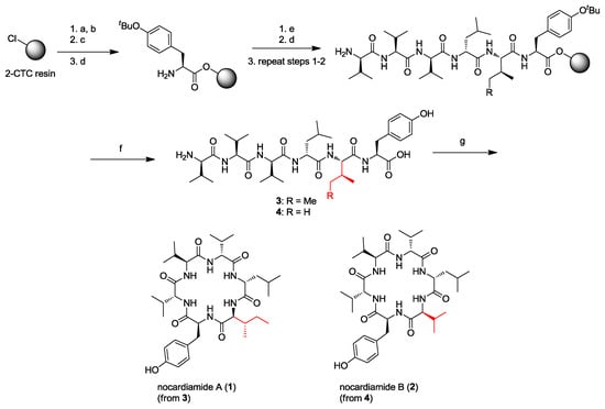 Solid-phase synthesis of nocardiamides A (1) and B (2) on 2-chlorotrityl chloride (2-CTC) resin. Reagents and conditions: (a) Fmoc-Tyr(tBu)-OH; (b) HBTU, DIPEA, and DMF (r.t., 1.5 h); (c) MeOH (r.t., 0.5 h); (d) 20% piperidine/DMF (r.t., 20 min); (e) Fmoc-AA-OH, HBTU, DIPEA, and DMF (r.t., 0.5 h); (f) TFA/thioanisole/PhOH/1,2-ethanedithiol/H2O (82.5/5/5/2.5/5) (r.t.; 31.1% yield for 3 and 47.8% for 4 after RP-HPLC purification); (g) HBTU, DIPEA, and DMF (r.t.; 7.2% yield for nocardiamide A (1) and 10.7% for nocardiamide B (2) after RP-HPLC purification).
