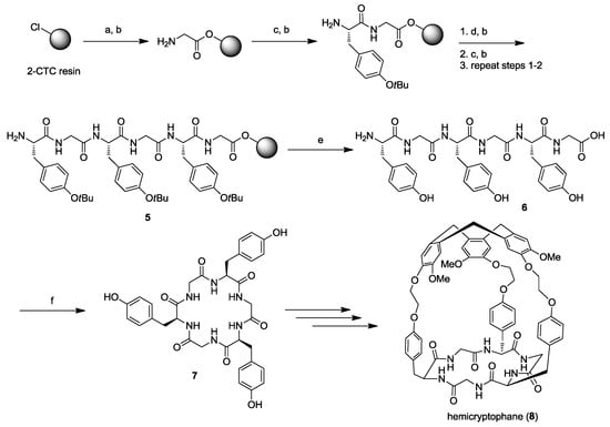 In 2013, Cochrane et al. reported the synthesis of the first members of a new class of cyclic-peptide-containing hemicryptophanes (e.g., 8 in Scheme 2) [30]. From this work, the solid-supported linear hexapeptide 5 was prepared from 2-CTC resin by standard microwave-assisted 9-fluorenylmethoxycarbonyl (Fmoc) SPPS (Scheme 2). Cleavage of the hexapeptide from the resin was done using 5% TFA in CH3CN/H2O (4:1), affording the unprotected linear peptide 6 in 85% yield. Subsequent cyclization of 6 using (benzotriazol-1-yloxy)tripyrrolidinophosphonium hexafluorophosphate (PyBOP) in dimethylformamide (DMF) gave the cyclohexapeptide 7 in quantitative yield after 1 h. Interestingly, cyclization of 6 proceeded much faster than that of its corresponding O-tert-butyl protected linear peptide counterpart. Cyclic hexapeptide 7 was used to produce a new class of cyclohexapeptide-containing hemicryptophanes, which were investigated for their enantioselective binding properties by complexation with carnitine [30].