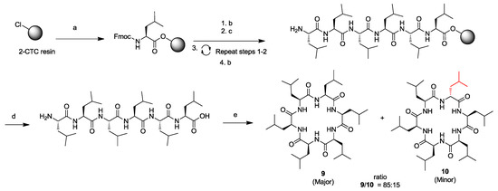 Solid-phase synthesis of 9 and 10 on 2-chlorotrityl chloride (2-CTC) resin. Reagents and conditions: (a) Fmoc-Leu-OH, DIPEA, and DCM (r.t., overnight); (b) treated twice with 50% piperidine/DMF (r.t., 10 min); (c) Fmoc-Leu-OH, HATU, DIPEA, and DMF (r.t., 2 h); (d) TFA/TIPS/H2O (95/2.5/2.5) (r.t., 2 h); (e) dropwise addition of linear peptide solution in DMF to solution of PyBOP, DIPEA, and DMF (over 3 h, r.t., overnight; 17% yield for 9 and 3% for 10 after preparative RP-HPLC purification).